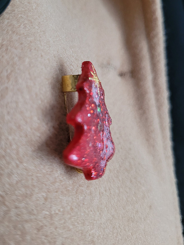 Unique handmade red glitter Christmas tree brooch using polymer clay, with gold-tone brooch pin on back.