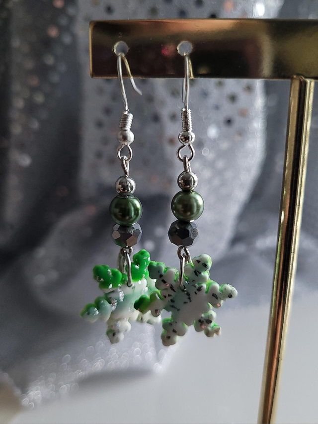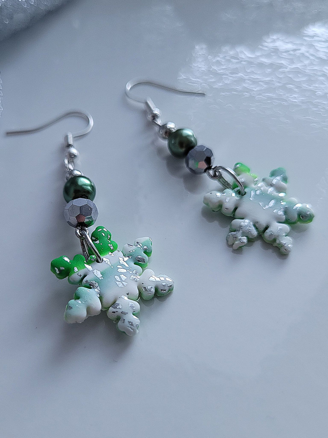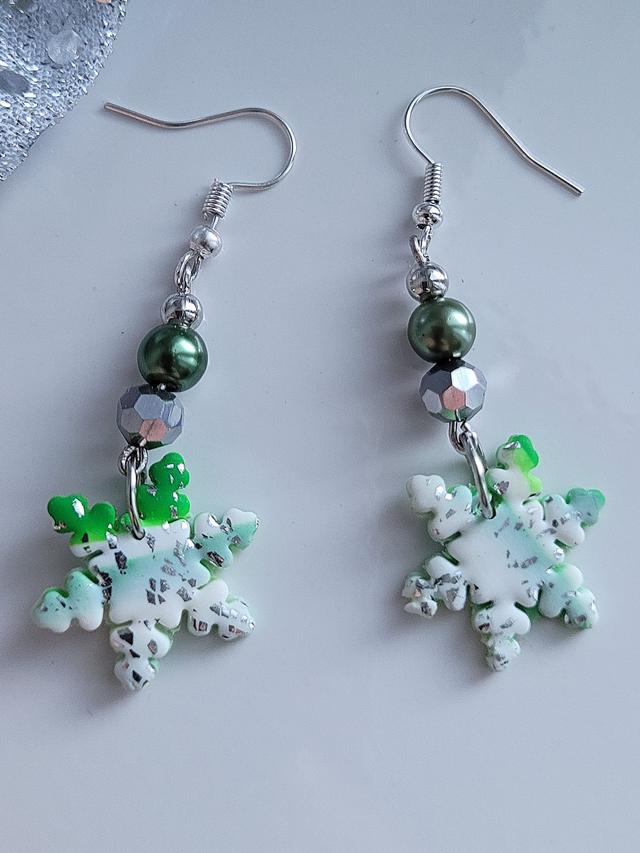 Unique handmade green and white snowflake drop earrings using polymer clay, along with ceramic beads and silver-tone alloy findings. Fun and cheerful Christmas earrings.